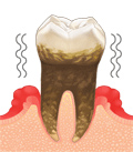 炎症が歯槽骨を破壊し、わずかしか支える骨が残っていない状態です。歯肉は腫れ、痛み、膿が出ます。外科的治療が難しい場合、抜歯の可能性が高くなります。